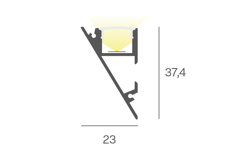 Single-emission aluminum profile for wall installation, with internal housing designed for driver insertion. Available in 33 or 52cm bars, and other lengths and in various colors and light tones on request.