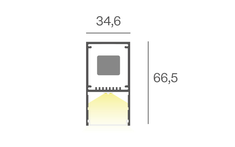 Rectangular section aluminum profile, for ceiling mounting, with internal housing prepared for driver insertion. Available in bars from 20cm to 2m, in different colors and light tones